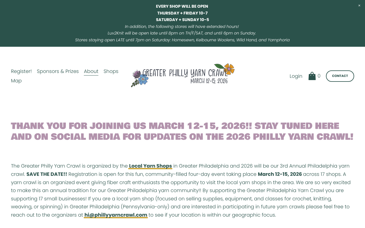 The Greater Philly Yarn Crawl connects 17 yarn shops across the Greater Philadelphia area over four days. You get a free shop-specific pattern at every stop, so even a partial crawl builds up a nice collection. A tiered prize structure scales with how many shops you visit, from four stops up to all seventeen, and each shop runs its own giveaway on top of that. Five percent of registration fees go to PA Fibershed, a nonprofit working to rebuild Pennsylvania's local textile economy by connecting the state's farmers, mills, dyers, and makers. The pattern-at-every-shop model means you're coming home with something from each visit whether you win a prize or not.