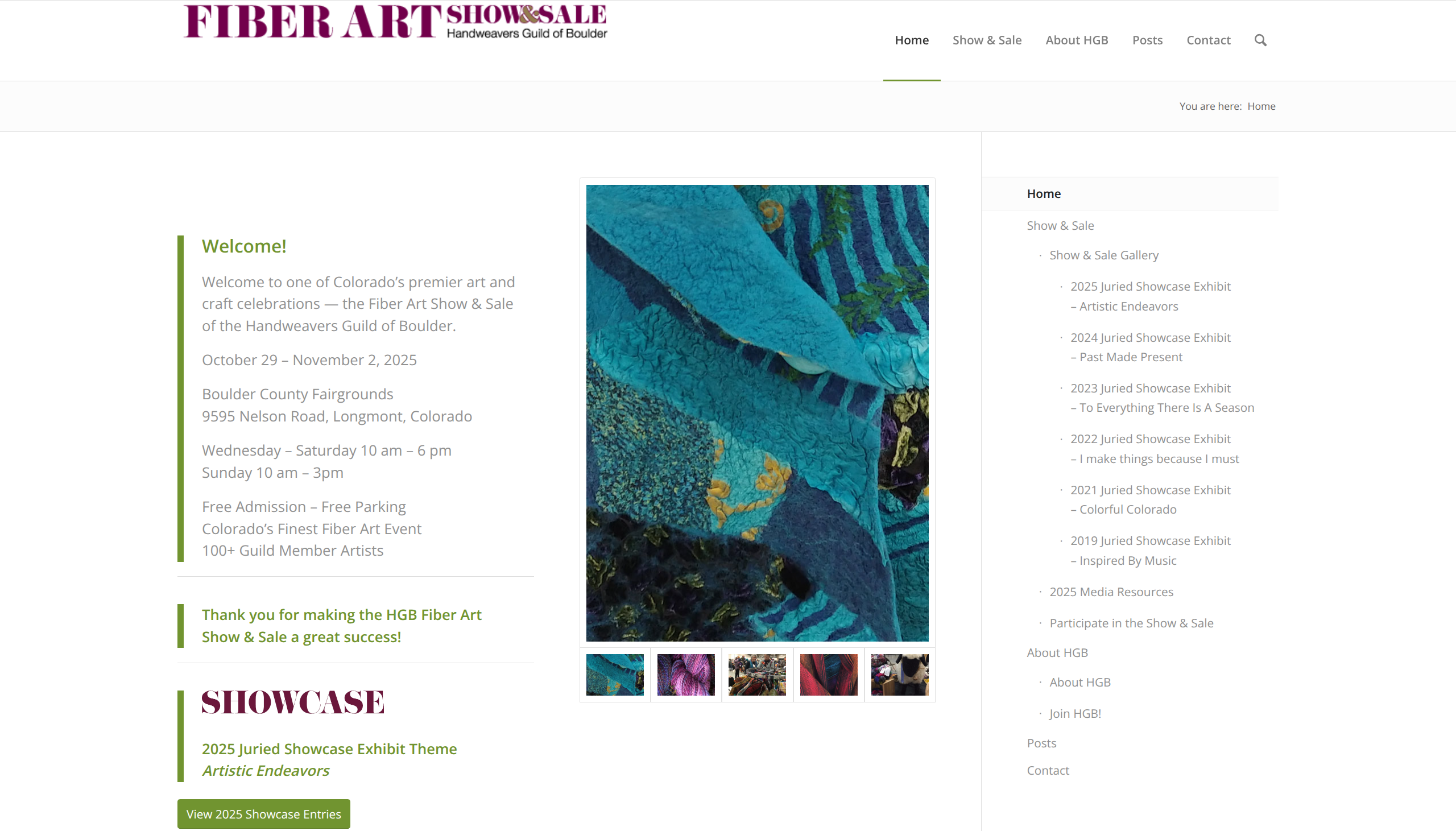 The Handweavers Guild of Boulder hosts a five-day fiber art show and sale at the Boulder County Fairgrounds in Longmont, Colorado. More than 100 guild member artists display and sell handwoven and fiber art work, making this a show where everything on offer was made by the people in the room. A juried showcase exhibit anchors the event with a rotating annual theme, and guild members demonstrate fiber techniques throughout the five days. The show-and-sale format and the guild-member-only vendor pool give it a different feel from a typical fiber marketplace: you're browsing the creative output of a single, established weaving community rather than a mix of commercial and indie sellers.
