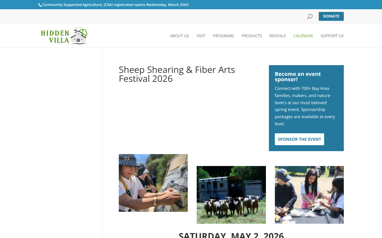 The Sheep Shearing & Fiber Arts Festival is a single-day event held at Hidden Villa, a working farm in Los Altos Hills, California. The format walks you through the wool process hands-on: five sequential stations take you from shearing through skirting, carding, spinning with drop spindles, and contributing to a community weaving project. Sheep shearing and herding demonstrations run alongside a fiber artist gallery featuring Bay Area makers and vendors. Live music and local food vendors fill out the day. Parking is at nearby Foothill College with shuttle service to the farm.