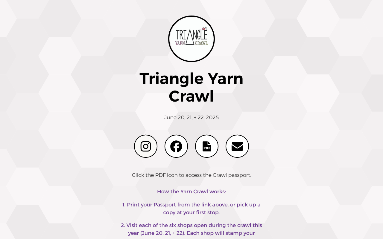 The Triangle Yarn Crawl is a self-guided tour of six independent yarn shops across Durham, Wake, and Orange counties in North Carolina's Research Triangle. You collect passport stamps at each shop and visit in whatever order suits your route, with completed passports entering you into a grand prize drawing. Each shop runs its own sales, raffles, and promotions during the crawl, so every stop has something going on beyond the stamp. The first ten customers meeting a minimum spend at each shop each day get a limited-edition tote bag, which is a nice incentive for the early risers.